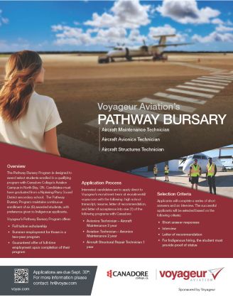 The Pathway Bursary Program offers selected students a full tuition scholarship, summer employment, mentorship from Voyageur Aviation select Aircraft Maintenance Engineers throughout school term, and a guaranteed offer of full-time employment upon completion of their program. Qualifying programs at Canadore College include Aircraft Structural Repair Technician (1 year), Avionics Technician – Aircraft Maintenance (2 years), and Aviation Technician – Aircraft Maintenance (2 years). Learn more: Click Here